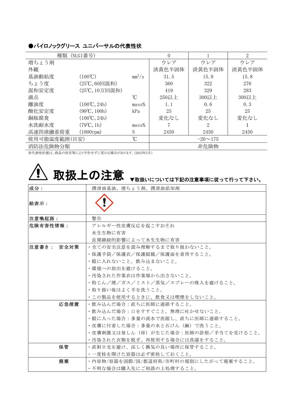 パイロノックユニバーサルは増ちょう剤としてウレア、基油として高度に精製した鉱油を用い、 極圧剤、サビ止め剤など厳選した添加剤を配合しているグリースです。