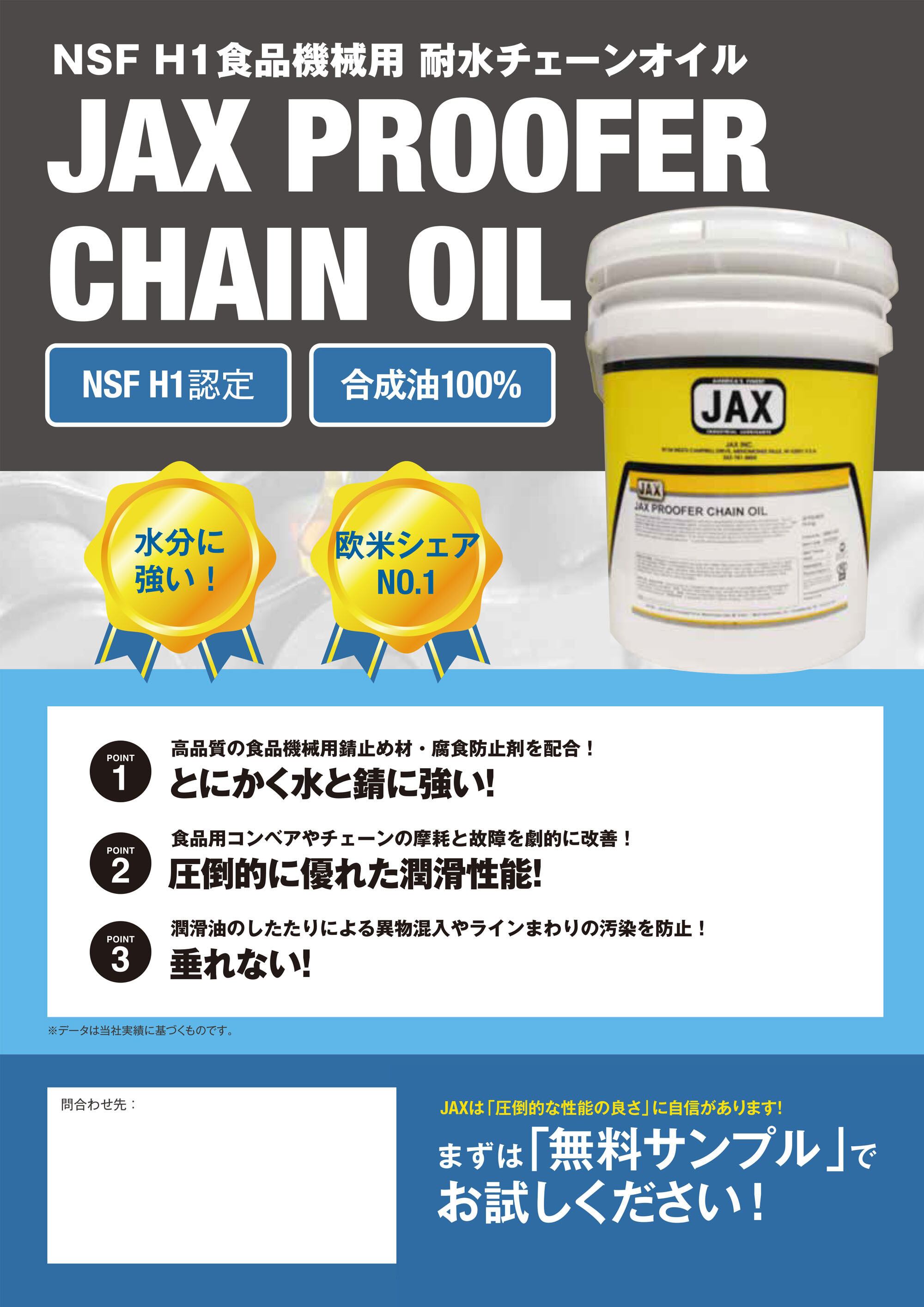 プルーファーチェーンオイルは、水濡れや高湿度環境下でのチェーン潤滑油として開発されたNSF H1認定潤滑油です。