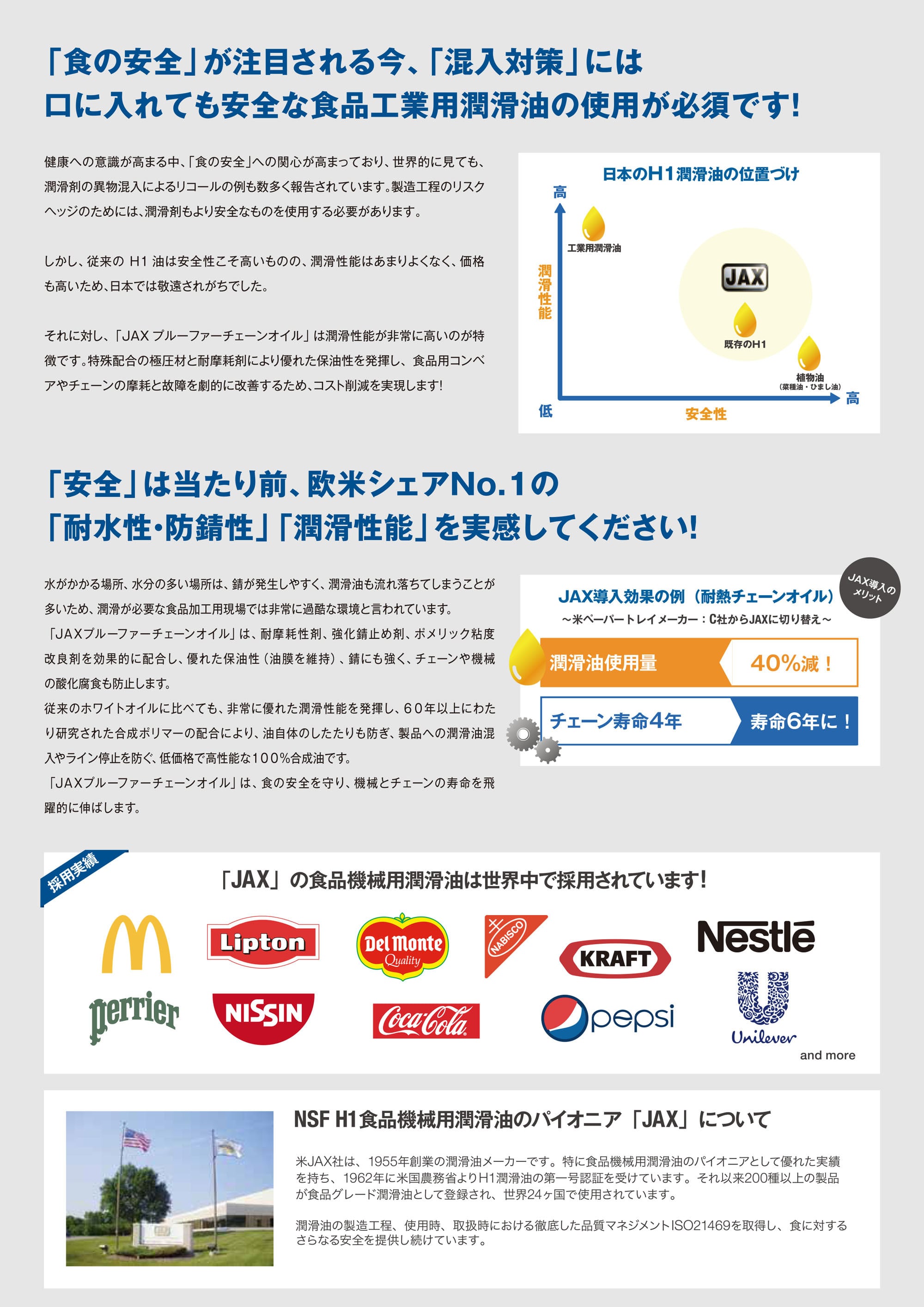また、高品質の食品機械用錆止め材・腐食防止剤を配合で、湿気によるチェーンや部品の錆を防ぎ、寿命を延長することが可能です。