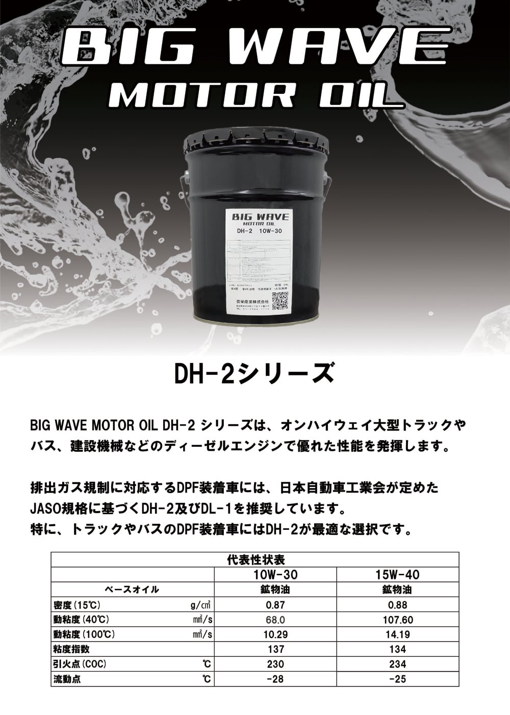 BIG WAVE MOTOR OIL DH-2 は、オンハイウェイ大型トラックやバス、 建設機械などのディーゼルエンジンで優れた性能を発揮します。