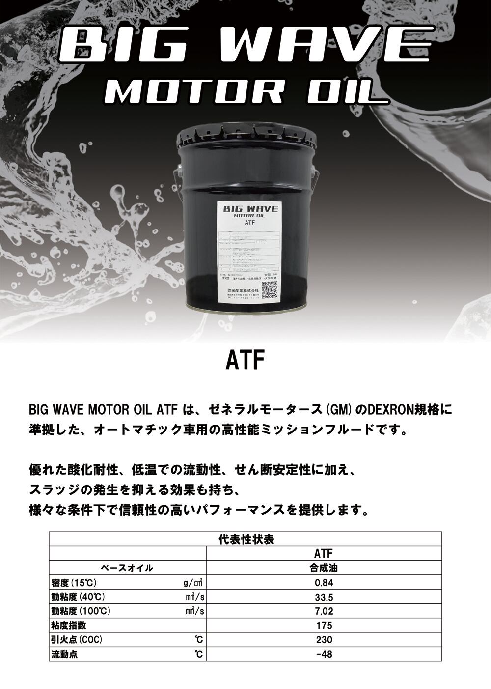BIG WAVE MOTOR OIL ATF は、ゼネラルモータース(GM)のDEXRON規格に準拠した、 オートマチック車用の高性能ミッションフルードです。