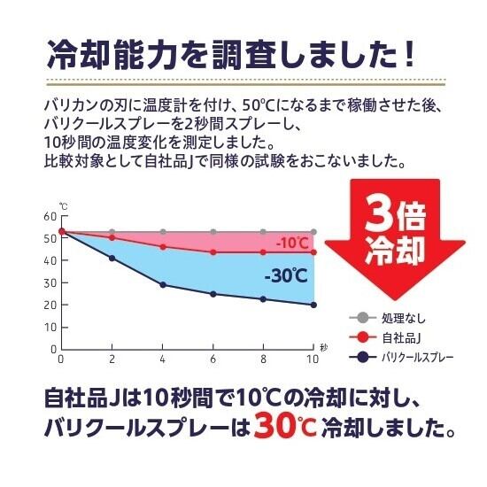 バリカンの刃を50℃になるまで稼働させた後、バリクールスプレーを2秒間スプレーし、10秒間の温度変化を測定。